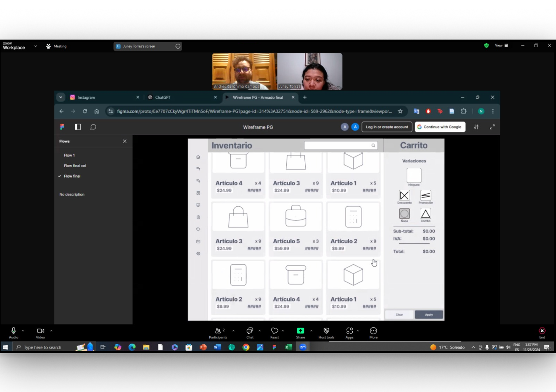 Three rounds of prototyping were done with the purpose of testing and refining the functionalities of the prototype. Each round was held with five participants via separate zoom calls where each participant interacted with the current prototype while trying to complete a determined flow. Once the flow was completed, the participant gave their respective feedback and opinions regarding the current state of the wireframes.